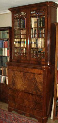 - mahognyfanerad chiffonjé. Framsidan med pyramidmahogny. Tre lådor, en lucka och ovanför luckan en mindre låda. Inredningen består av tio smålådor och ett fack i form av en pelarsal. Ovanpå står ett bokskåp i mahogny med glasdörrar, spröjsade lister med växtmotiv.