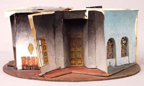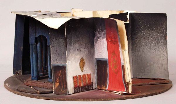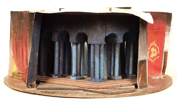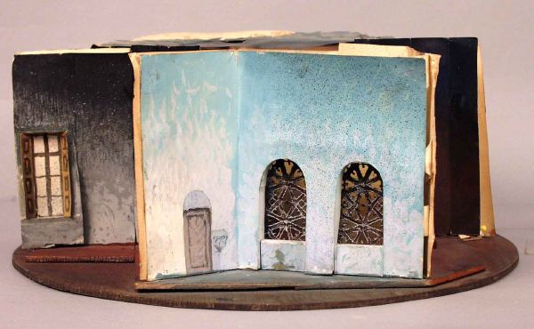 - på den tunna cirkelrunda grundplattan av trä har de olika scenbilderna markerats genom att tunna träskivor i olika format limmats och spikats ovanpå grundplattan, dek delar av papper och trä har sedan limmats på och mot varandra och på de olika "scengolven" eller på grundplattan, blå plastfilter delvis monterat över pelargången, fastsatt med häftstift och tejp, fönstergallren utgörs av tyg.