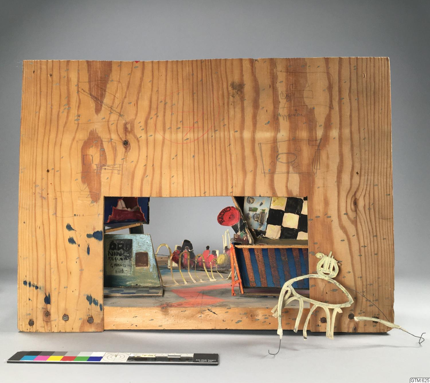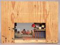 - Tittskåp - men utan sidor och lock. Träram inramar scenbilden som består av en t v blågrå vägg med affischer, en liten rutig platå framför, i mitten ett glest staket (?), i förgrunden på höger sida en blå- och gulrandig vägg på liten platå med tak, ovanpå det en svartvit-rutig, affisch och skylt med RADIO t h, i bakgrunden mitt på scenen figurer i olika färger (orkester?), små uppbyggda scener på pelare i bakgrunden, ljusblått scengolv som från framscenen har ett brett rött sicksack-streck som avslutas ut mot höger sida.