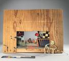 - dek delar av papper och trä är limmade på tjock grundplatta (c:a 2 cm) av träplank, framsidan av fanér är fastspikad mot grundplattans nerkant.