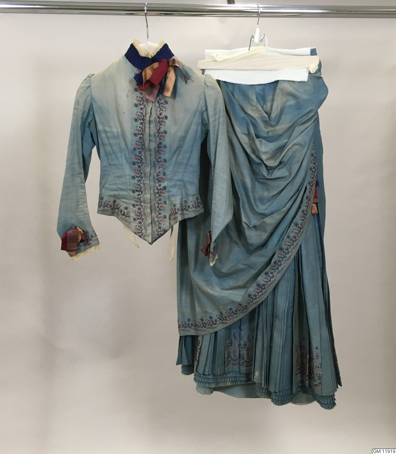 Klänning av blått bomullstyg. Livet åtsittande går ned i snibb fram och bak. Knäppes fram först osynligt med 20 st små överklädda knappar, däröver med hakar och hyskor; fram och nedtill broderade remsor: blomslingor sytt med blått, vitt och rött. Hög krage av blå atlas med en veckad remsa samt en veckad vit spets kring hakan. På vänster sida en rosett av sidenband i blått, rött, beige och brunt. Ärmen sydd av två stycken med broderad remsa, rosett och spets. Kjolen sydd av blått fodertyg veckad: omväxlande tätare veckpartier och partier med bredare veck och broderier; tunik draperad fram och upp på vänster sida bak; går längre ned på höger sida och bak en särskild våd som bildar turnyren; garneringsrosetter; nedtill på undertyget en kant av tre veckade krus.