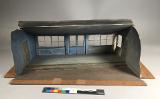 - Rum i gråblå nyanser med snedtak in över halva scenbilden, dörr på båda sidor samt ett fönster på höger sida, mittväggen har paneler och väggfält under fönstren på båda sidor om en glasad dubbeldörr, trappsteg upp till avsatsen som går från sida till sida.