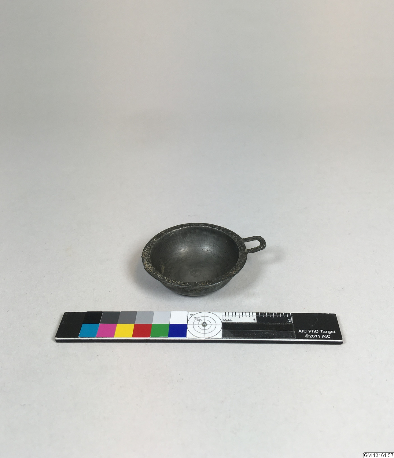 Låg, vid karott med handtag men utan lock för dockskåp. Ett handtag saknas.