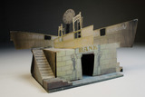 - Ljusgrå murad fasad med ingång och portal i mitten med BANK ovanför öppningen, en trappa efter väggen på vänster sida leder upp till det platta taket som har påbyggnader med texter (t ex: KREDITIV) och en klicka med romerska siffror.