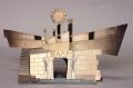 - träskivor och klossar limmade på och mot varandra och på den för scenbilden exakt utskurna grundplattan av trä, dek delar av papper limmade mot och ovanpå träkonstruktionen, delvis med utskjutande delar upptill.