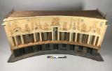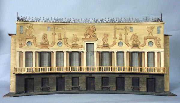 Gul fasad, något bågformad visar entré med bruna dörrar, små alkover med bänkar där emellan, balkong över med balustrad och kolonner mellan de fyra höga fönstren på var sida om det i mitten som är något högre, reliefutsmyckning på väggen ovanför, på takkanten dekorativ stålkonstruktion.; modellen av trä med utskurna detaljer, är monterad genom limning och på tunn grundplatta av trä.