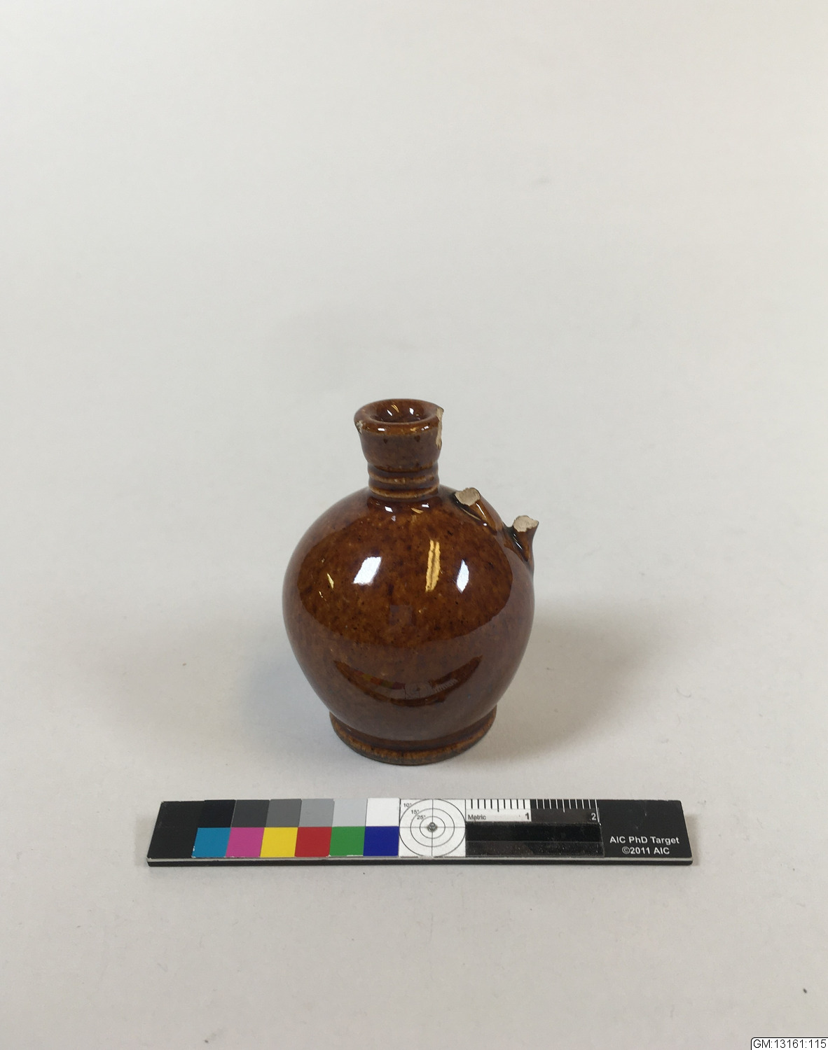 Kanna, krus med runs form och smal hals. Handtaget saknas.