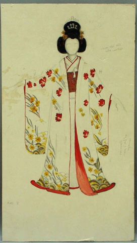 - Kvinna med svart uppsatt hår med kammar och gula blommor, iklädd vit lång omlottklänning med röda kantband vid hals och fållkant, vit fotsid, med släp, kimono som har blommor i rött och gult, bladslingor och andra mönster i i gult och silver, rött foder och röda kantband, rödmönstrat bälte.
