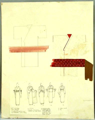 - Detaljbeskrivning av japansk geishadräkt. Överst t v: vit underklänning, rosa underbälte, överst t h: vit mönstrad kimono med rött foder, samt ett mönstrat bälte i rött, rosa och guld. Nederst fem figurer i tusch där det beskrivs hur man tar på en geishadräkt. (se vidare under påskrift)