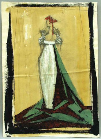- Kvinna med rött uppsatt hår och korkskruvslockar målad mot beigefärgad bakgrund med svart inramning, är iklädd vitt dekolleterat och högt placerat liv med kort puffärm och hög guldkrage, vit hellång kjol, mycket omfattande släp i grönt och brunt, draperat också framför fötterna.