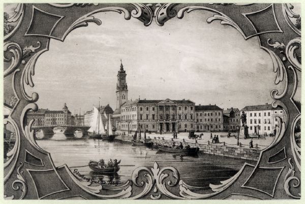 Gustav Adolfs torg m.m. sett från sydost. detalj ur litografi: "Minnen af Sverige".