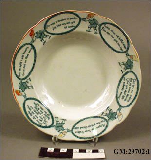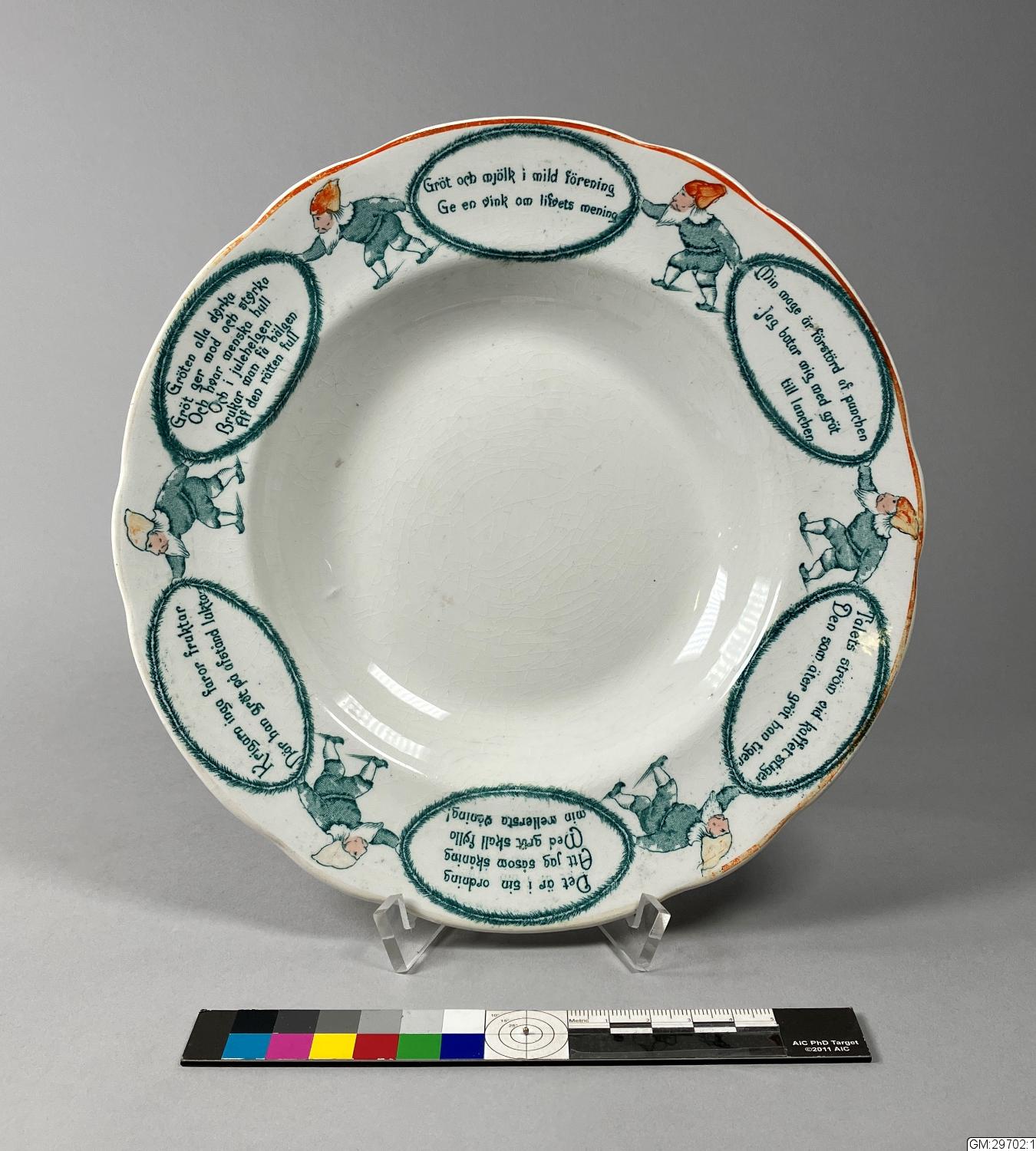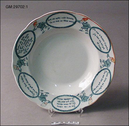 - Jultallrik - djup för julgröt, av flintgods med cremvit glasyr med tryckt dekor på brädden i grönt och rött: sex grötrim inom ovaler av lummer ammanbundna av lika många småtomtar, bräddens kant svagt vågformigt.