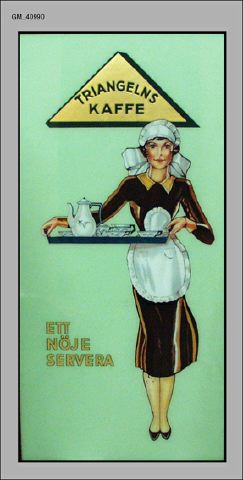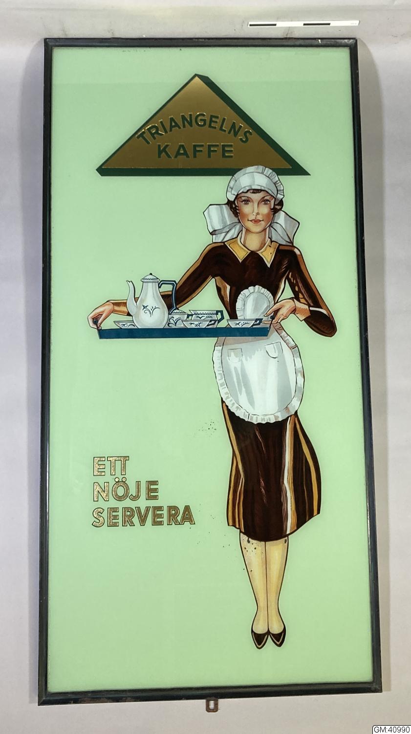 reklamskylt med grön bottenfärg föreställande en kvinna som håller en bricka med kaffeservis