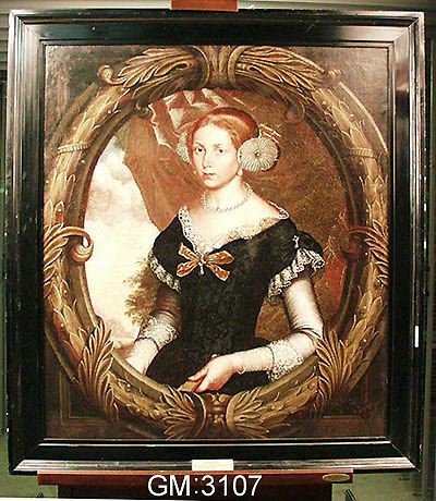 Kvinnan på tavlan kan ha koppling till släkten Ekeblad. Tavlan är sannolikt målad av Johan Johansson Aureller d.ä. under senare delen av 1600-talet. Målningen liknar andra verk av honom som finns på Läckö slott. (GM:3107) [Göteborgs födelse, 2017]
