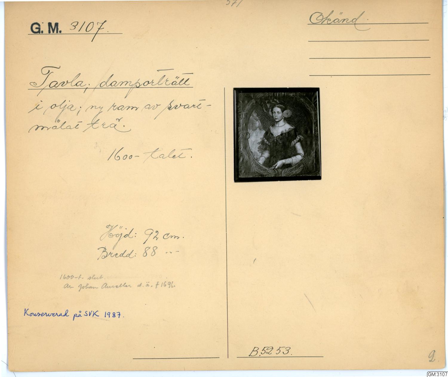 Tavlan uppvisar likheter med verk målade av Aureller på Läckö slott. [ctn]; Den avbildade kvinnan kan vara kopplad till adelssläkten Ekeblad från Stola i Strö sn nära Lidköping. Enl anteckning på katalogkort, sannolikt skriven av antikvarie fi.l dr Harald Widéen (enl bedömning från Christian Thorén). [Enl katalogkort]
