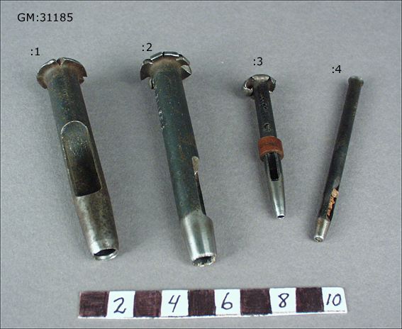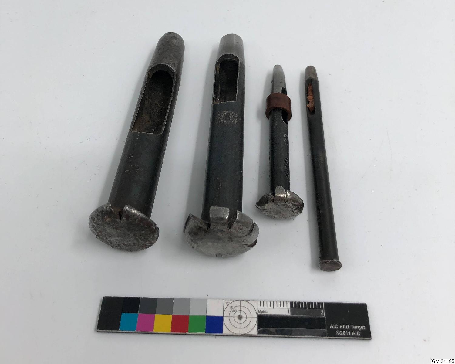 Fyra stycken hålstansar, verktyg för fotbollssömnad.