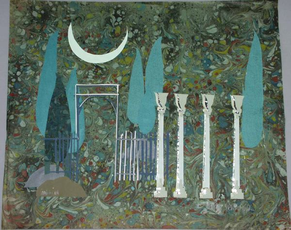 - På marmorerat papper i olika gröna nyanser med inslag av gult och rostbrunt är utklippt papper pålimmat och föreställer gröna träd, grått staket med portal på vänster sida, fyra ljusblå kolonner till höger.