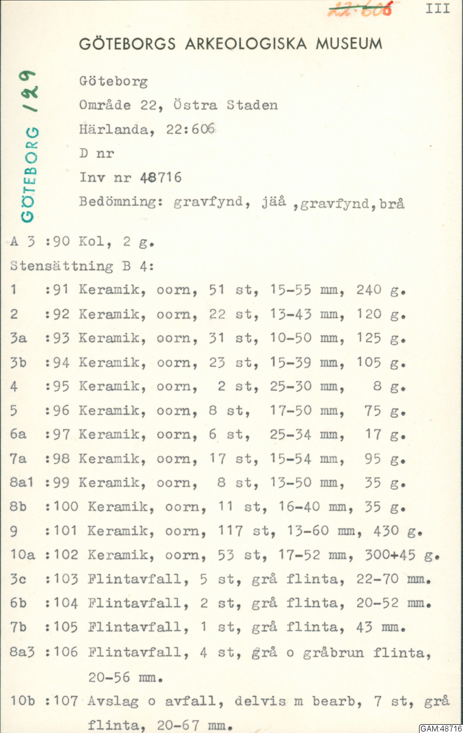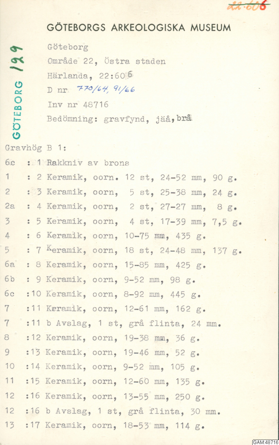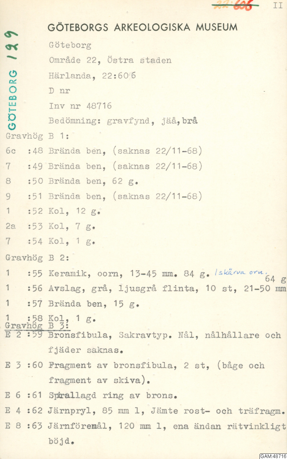 Forngravarna i Härlanda Göteborg I Gravfält A i Göteborgs musei årstryck 1951-52, sid 286 ff.