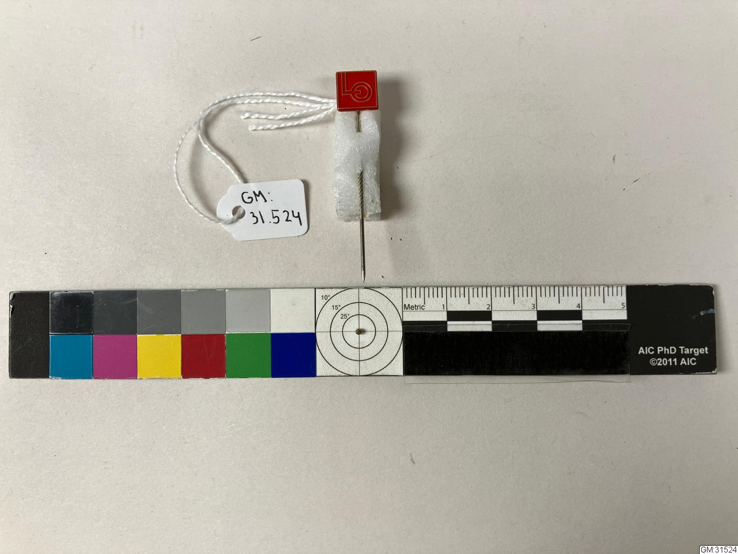 En nål med rött kvadratiskt huvud och bokstäverna "LO"