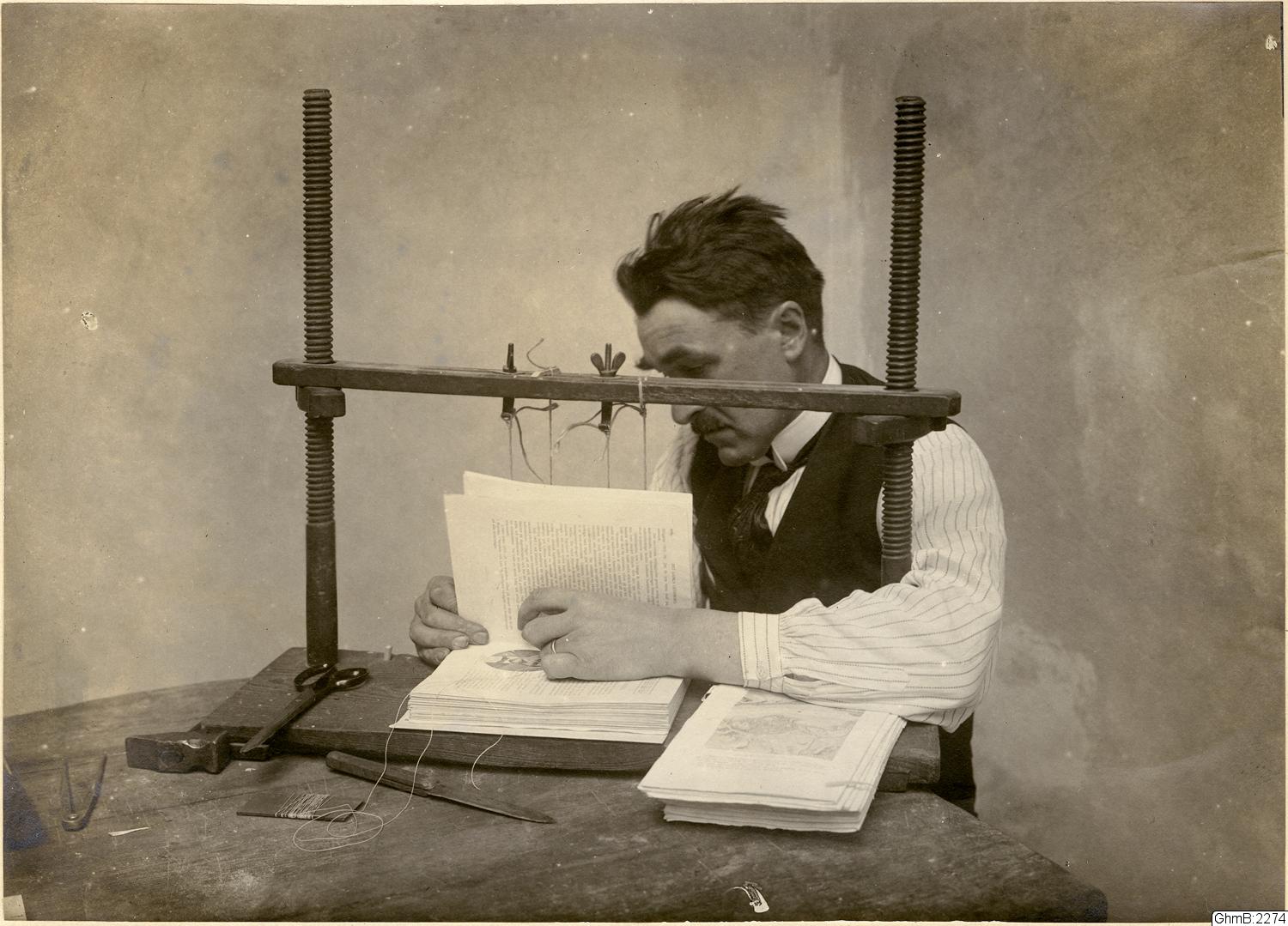 Bokbindning: häftning, papperet skärs och falsas (viks) till så kallade ”lägg” som sedan med hjälp av nål och tråd häftas ihop till ett bokblock. Ett lägg består vanligen av fyra ark vikta i varandra. Bilden från okänt bokbinderi