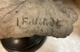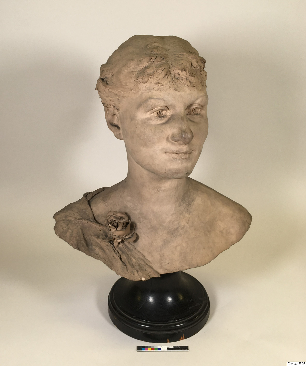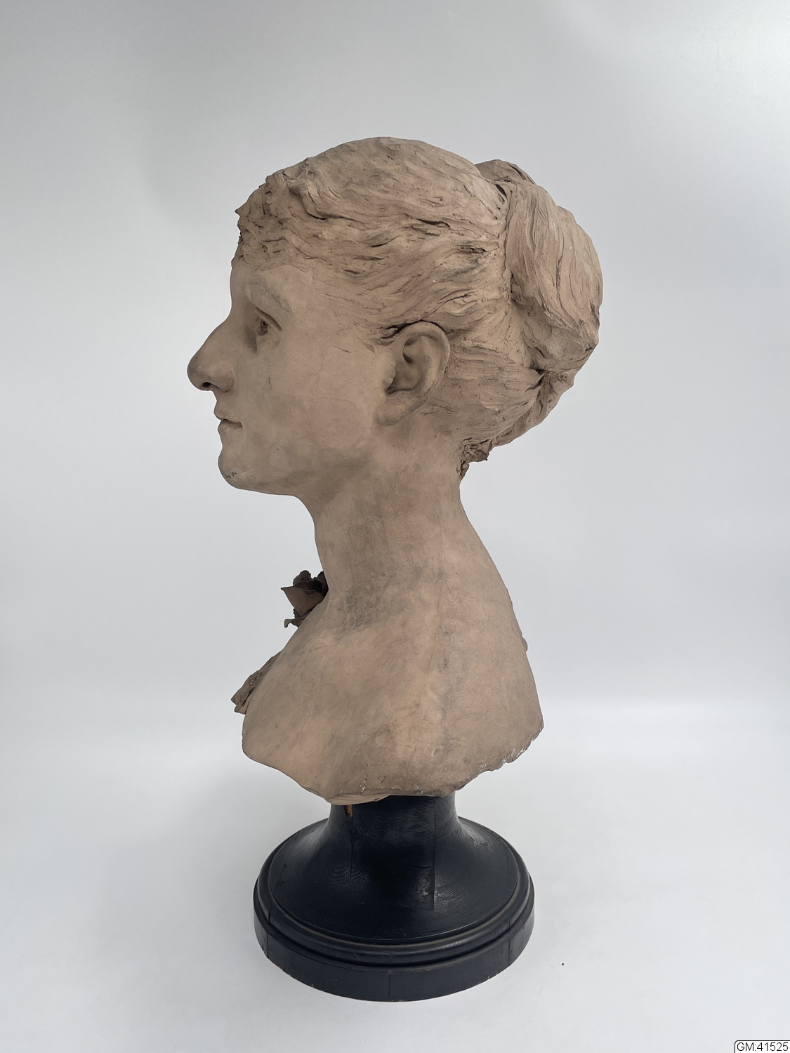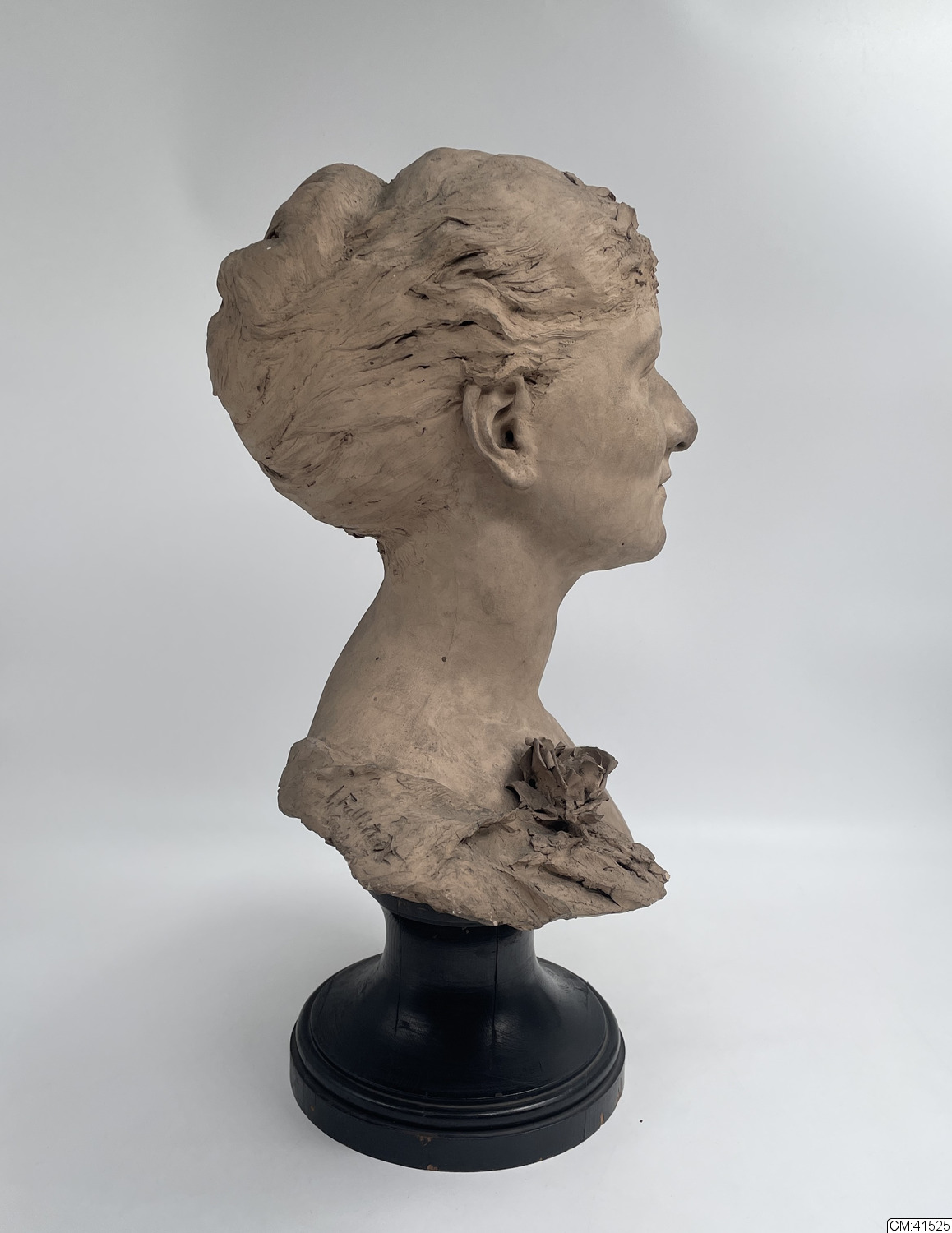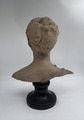 Skulptur i terrakotta av kvinnobyst. Skulpturen sitter på ett löst stativ i trä.