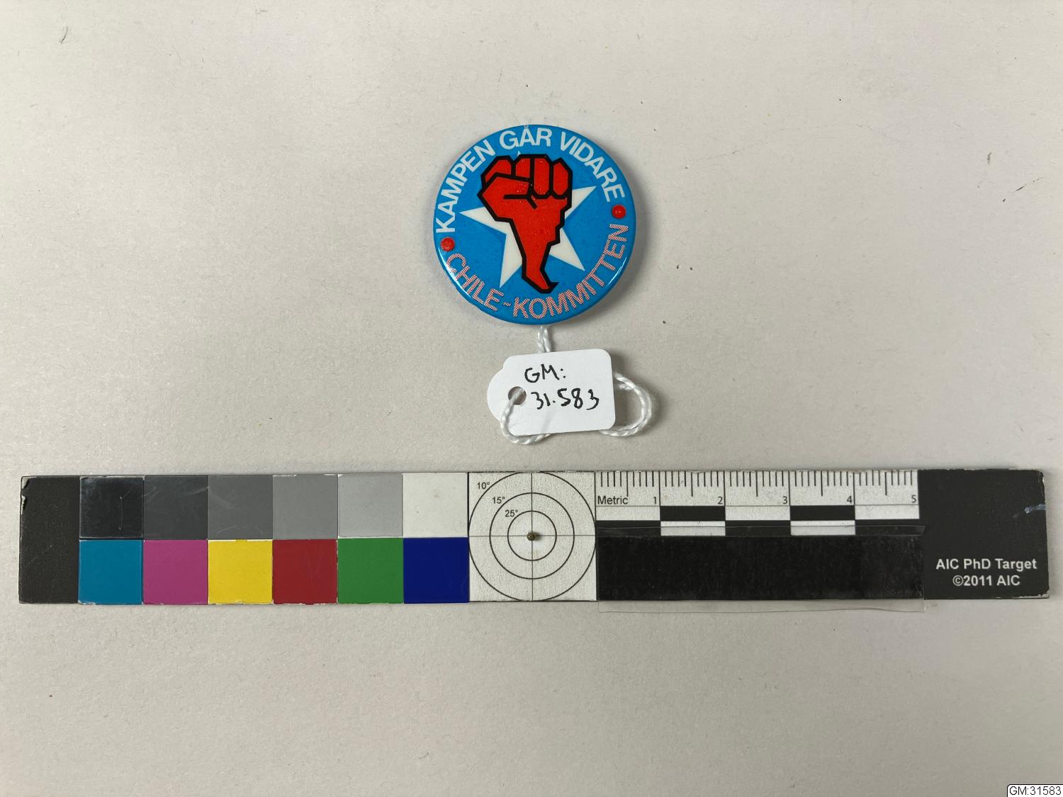 Ett rockmärke för Chile-kommitten[sic]. Runt och blått med en knuten röd hand ovanpå en vit stjärna text runtom: "KAMPEN GÅR VIDARE" "CHILE-KOMMITTEN"