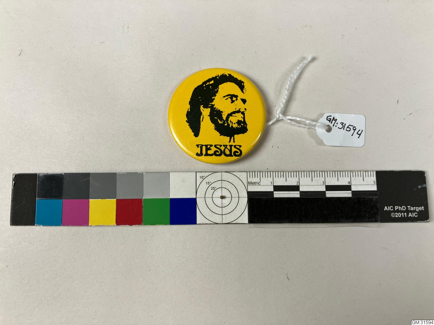 Ett runt rockmärke av metall gul botten med bild och text tryckt i svart: ett konventionellt porträtt av Jesus och texten "Jesus"