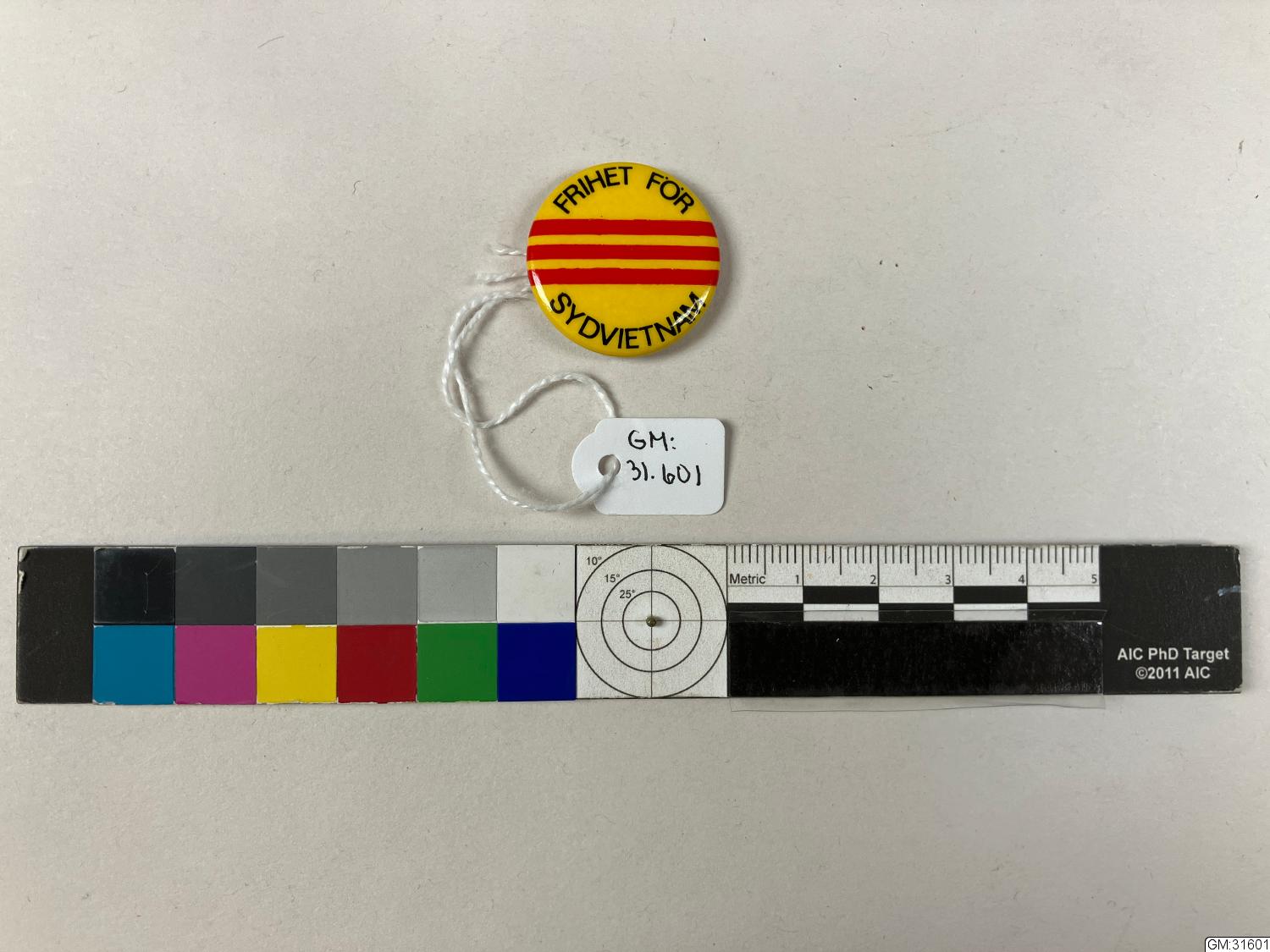 Ett rockmärke med gulbotten tre horisontella röda linjer samt texten "FRIHET FÖR" "SYDVIETNAM" i svart.