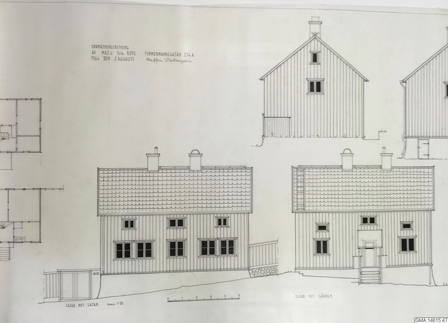 - Timmermansgatan 214 A, Majornas 1 Rote. Adressen uttolkas: Majorans 1 Rote no 214 A, med gatuadress Timmermansgatan. Uppmätningsritning på väv, sign Staffan Westergren 2 aug 1966.