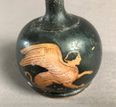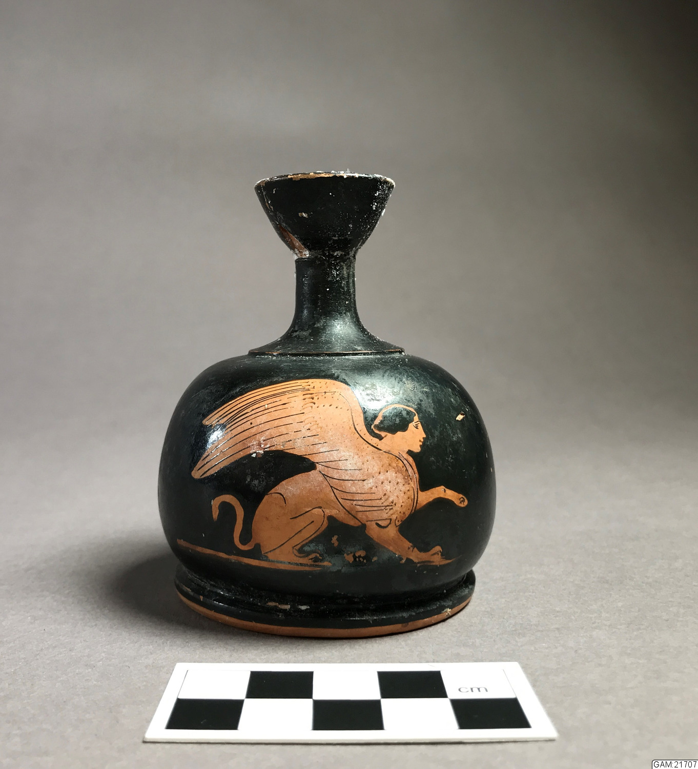 Rödfigurig lekyt (lekythos) från Pompeji med en röd sfinx mot svart botten. Lekythoi användes som kärl för parfymerad olja eller olja för hushållssyften. De var vanliga som gravgåva och användes också i begravningsceremonin. Den här sorten, en så kallad "squat lekythos", har vanligtvis rödfigurig dekor. Den rödfiguriga tekniken började användas i Athen runt 530 f.Kr. och runt 470 f.Kr. hade den nästan helt ersatt den svartfiguriga stilen.