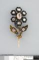 Beskrivning: Kråsnål i form av en blomma med två blad, i guld och silver samt taffelslipade diamanter, placerade både i blomman och på bladen, nålen är 3,4 cm hög och 1,9 cm bred och väger 4,9 gram. Kråsnålen är tellverkad ca 1880 och har tillhört Musikdirektör Joseph Czapek i Göteborg. GM:12035
