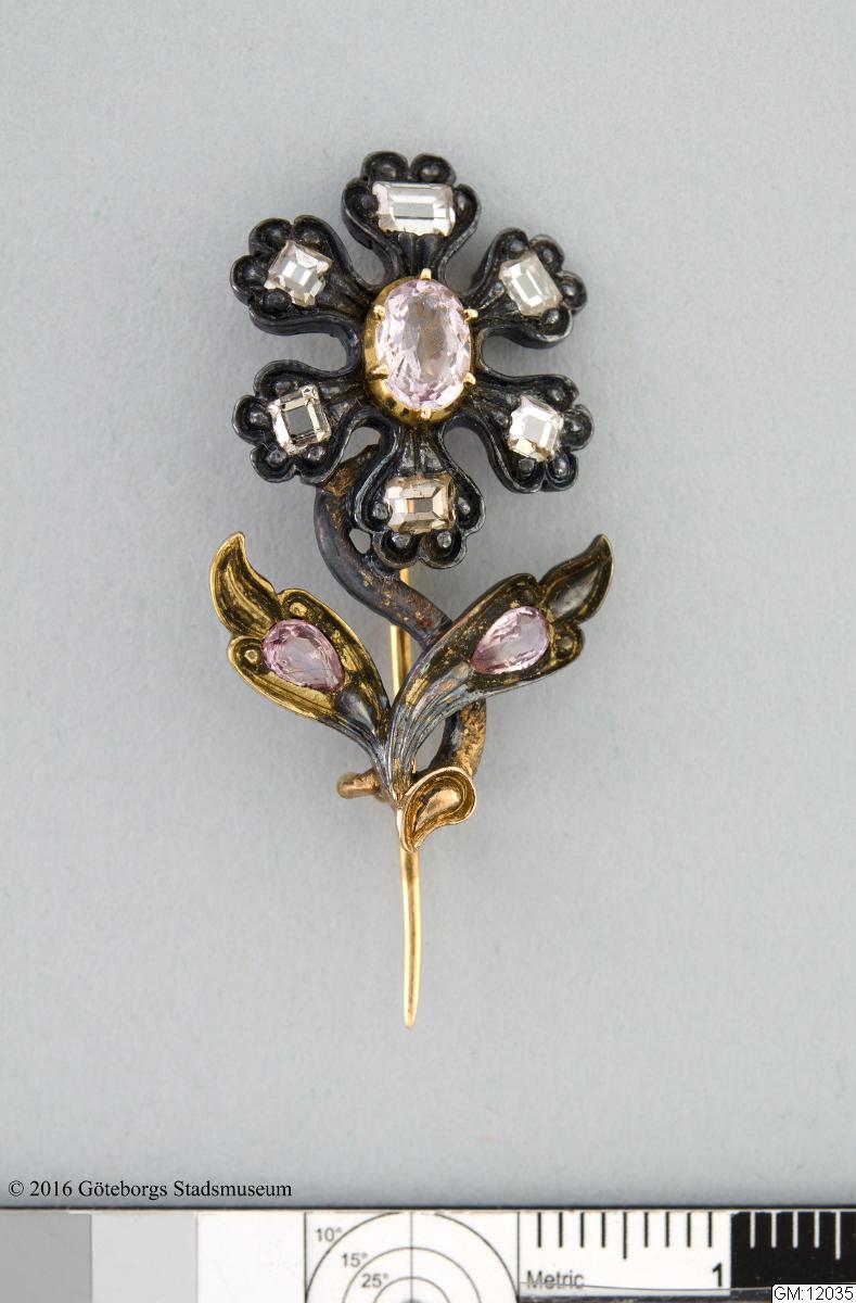 Beskrivning: Kråsnål i form av en blomma med två blad, i guld och silver samt taffelslipade diamanter, placerade både i blomman och på bladen, nålen är 3,4 cm hög och 1,9 cm bred och väger 4,9 gram. Kråsnålen är tellverkad ca 1880 och har tillhört Musikdirektör Joseph Czapek i Göteborg. GM:12035
