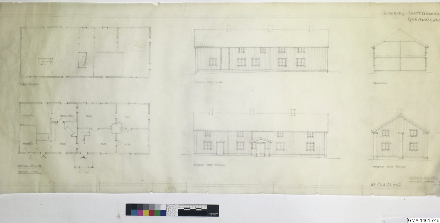 Uppmätningsritning av Gräfsnäsgården, Slottskogen, Göteborg. ; Slottsskogen: Gräfsnäsgården. Uppmätningsritning på papper, sign B Johansson juni 1963.