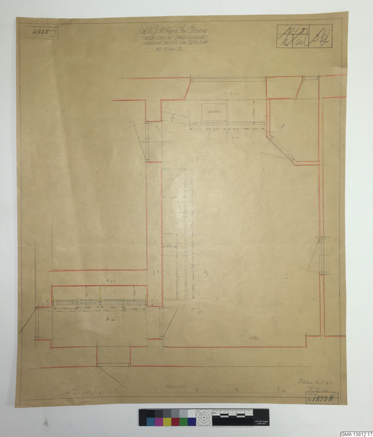 - Ritning av Gamla Barnhuset, Stampgatan 20. Inredning av kök och serv.rum no.12 och 13. Ritning av Folke Bensow, 16.5.1925.