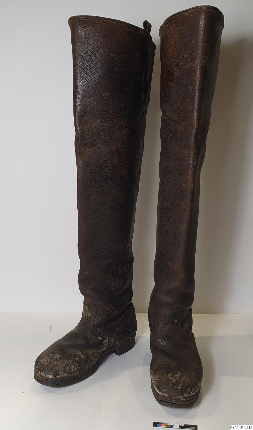 - Ett par sjöstövlar av brunt läder. Höga skaft, 66 cm vida upptill. 2 stroppar längst upp i varje skaft att fästa dem i. Järnskodda klackar. Sulorna pliggade med träpligg.