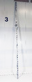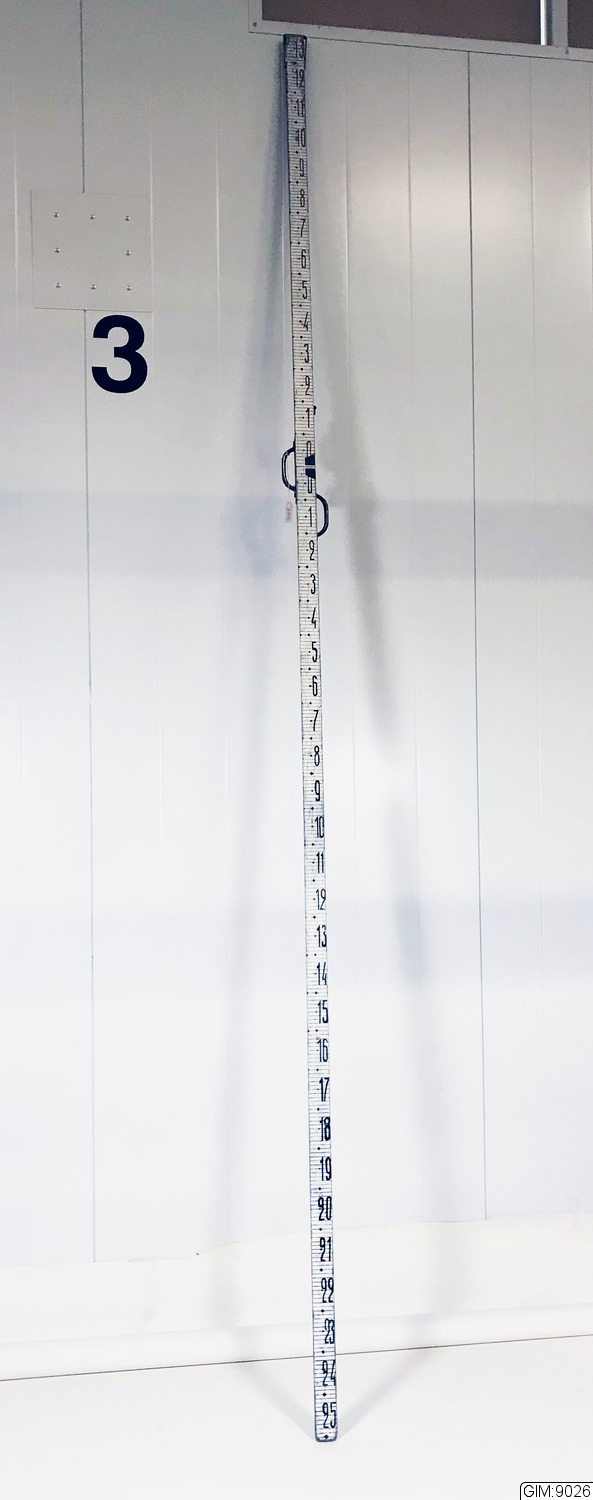 Mätstång med vattenpass. Svartvita markeringar. Handmålad.