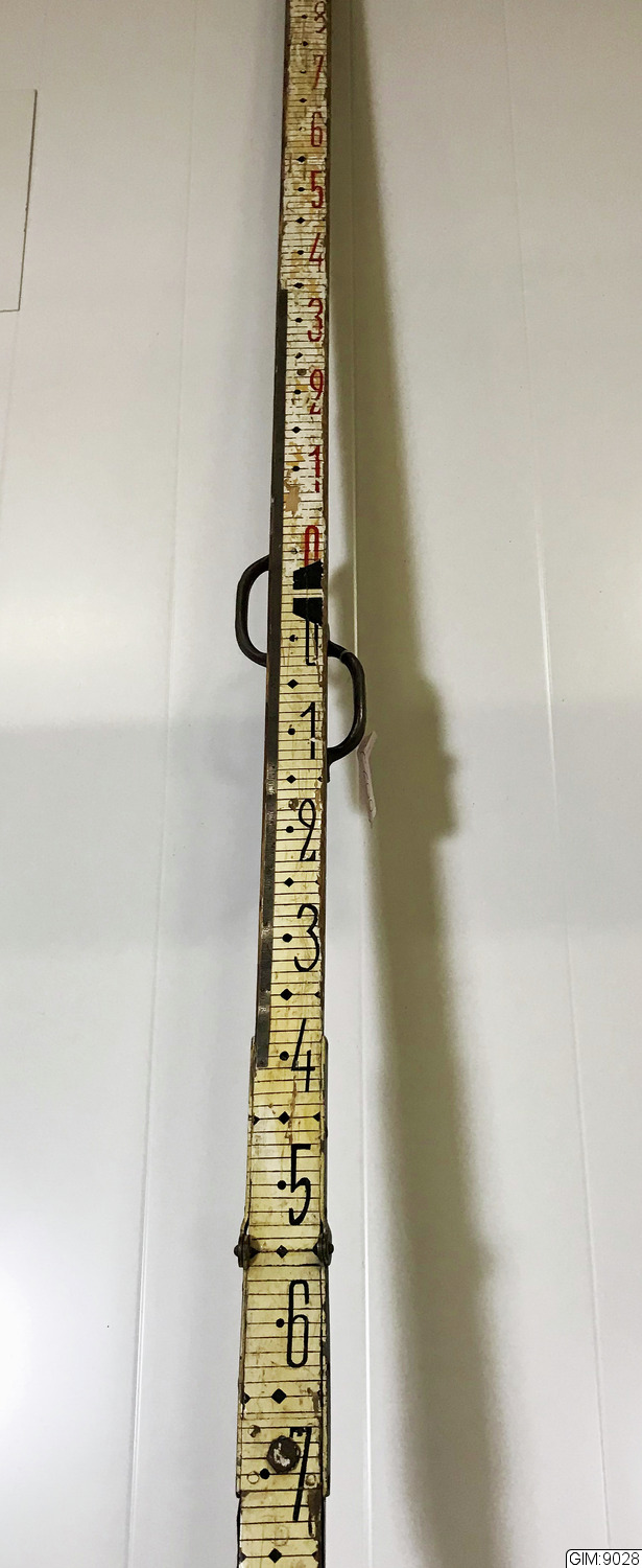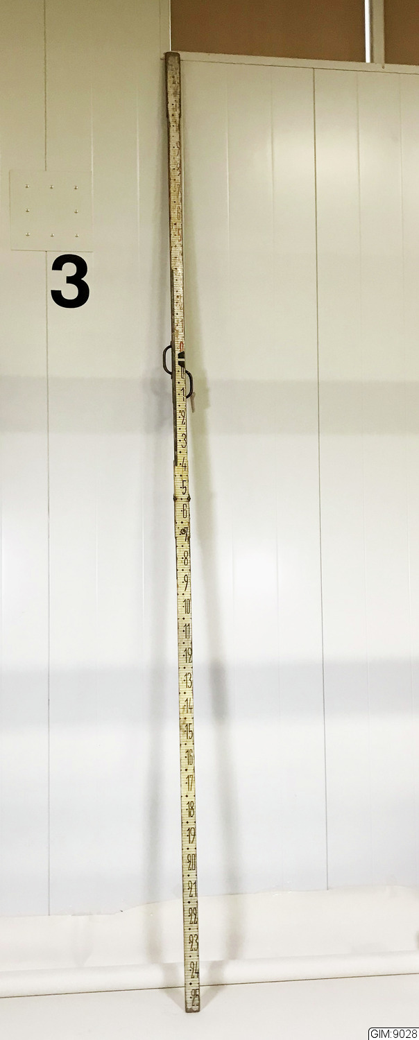 - Mätstång med vattenpass. Svartvita och röda markeringar. Handmålad.Hopfällbar -tvådelad. Märkt med Nedo, en firma som fortfarande tillverkar mätinstrument. Ett namn finns också på staven - Johan Anderssons.