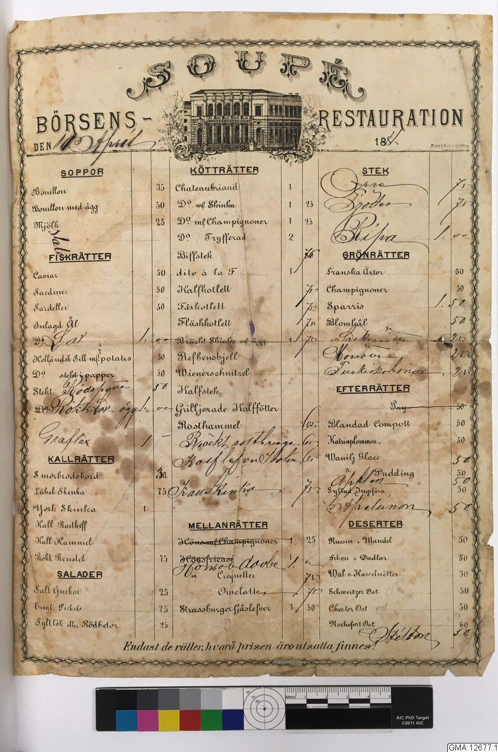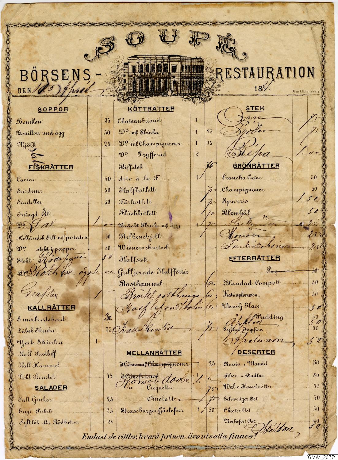 Matsedel för 'Börsens Restauration' dat. 11 april 1881.