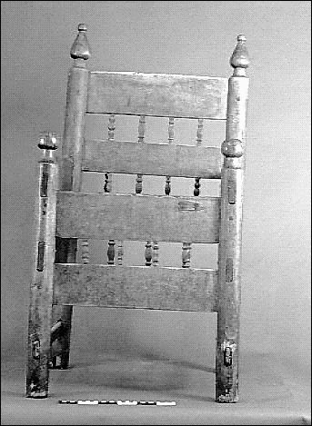 - Kyrkstol av trä (björk), med ramstycke för sittdyna. Ihopsatt med träplugg. Stolen har fyra runda hörnstolpar med krönande knoppar. Dessa förenas genom enkla brädor, mellan vilka en rad fyrkantiga balusterdockor. Sits saknas istället finns två slåar för en dyna. I bakbenen finns märken efter infällda trissor.##Litt: G.M. årstryck 1909 s.68#