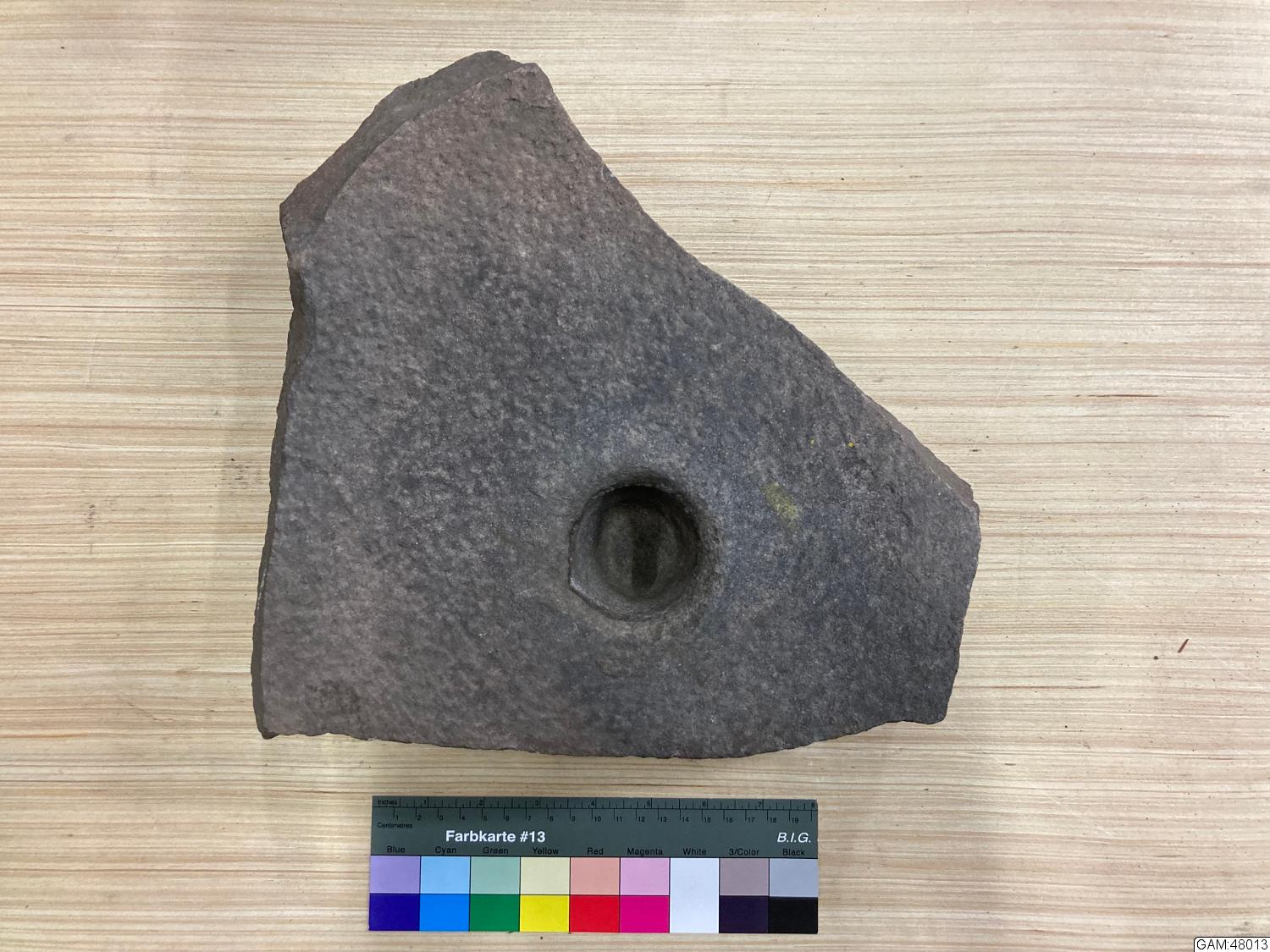 GAM:48013 :: kvartsitblock med skålformig fördjupning, slipsten