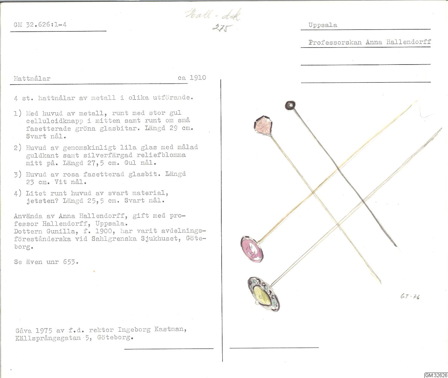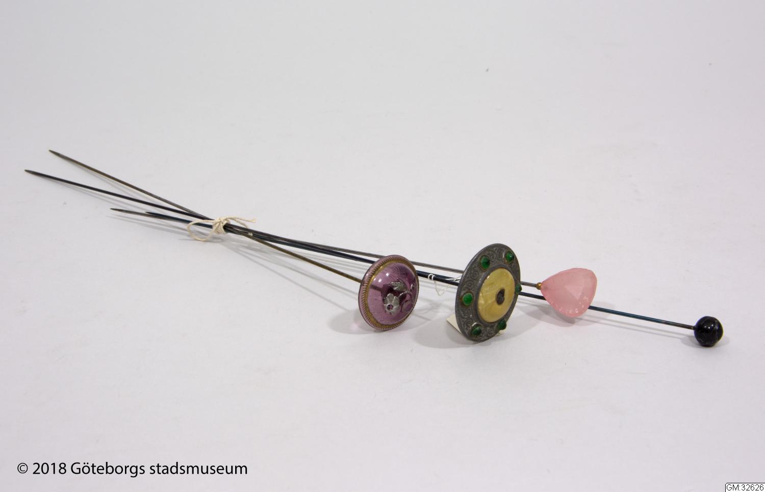 - Från katalogkort: Hattnålar, ca 1910. Fyra stycken hattnålar av metall i olika utförande. 1)Med huvud av metall, runt med stor gul celluloidknapp i mitten samt runt om små fasetterade gröna glasbitar. Längd 29 cm. Svart nål. 2) Huvud av genomskinligt lila glas med målad guldkant samt silverfärgad reliefblomma mitt på. Längd 27, 5 cm. Gul nål. 3) huvud av rosa fasetterad glasbit. Längd 23 cm. Vit nål. 4) Litet runt huvud av svart material, jetsten?. Längd 25,5 cm. Svart nål.