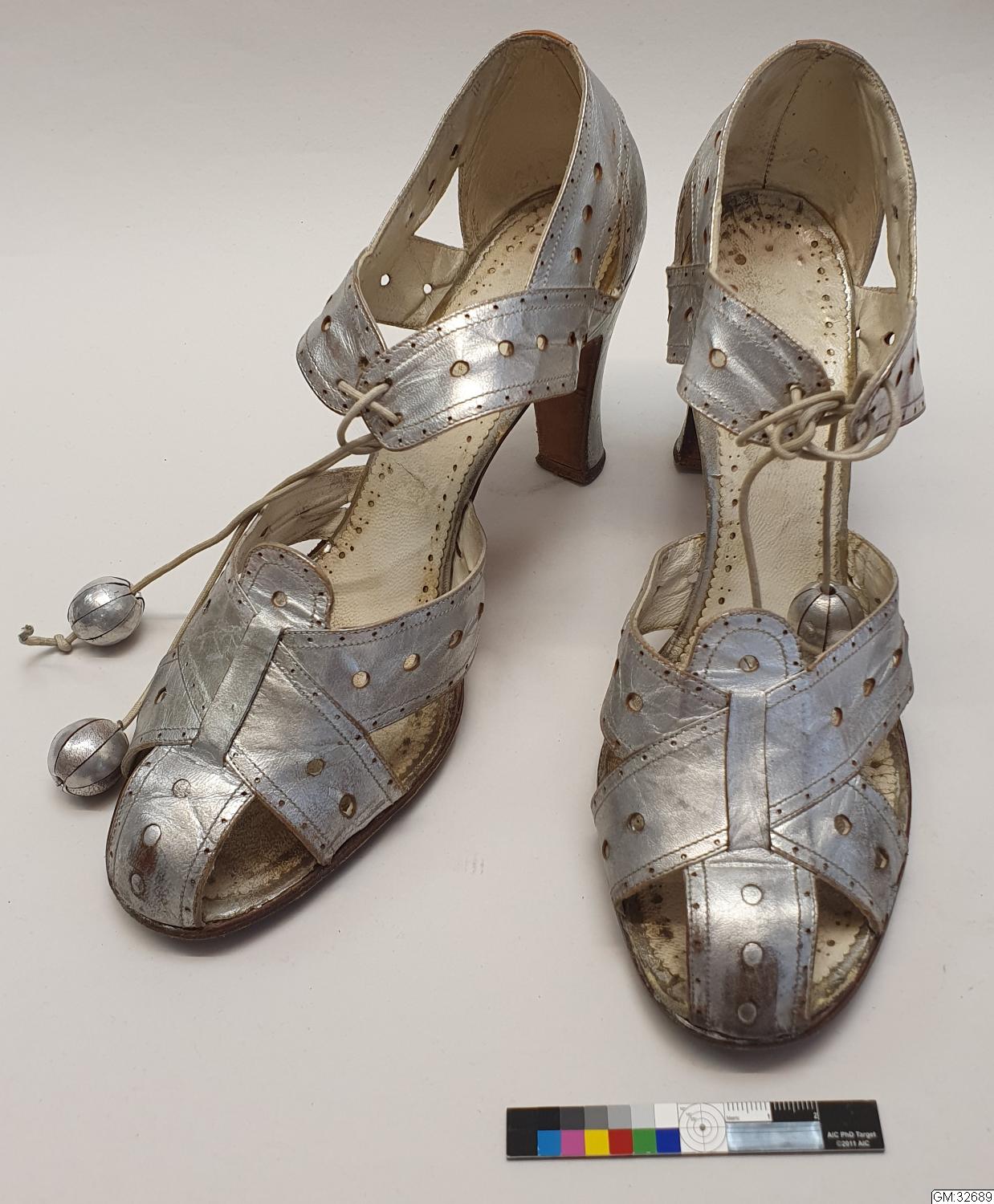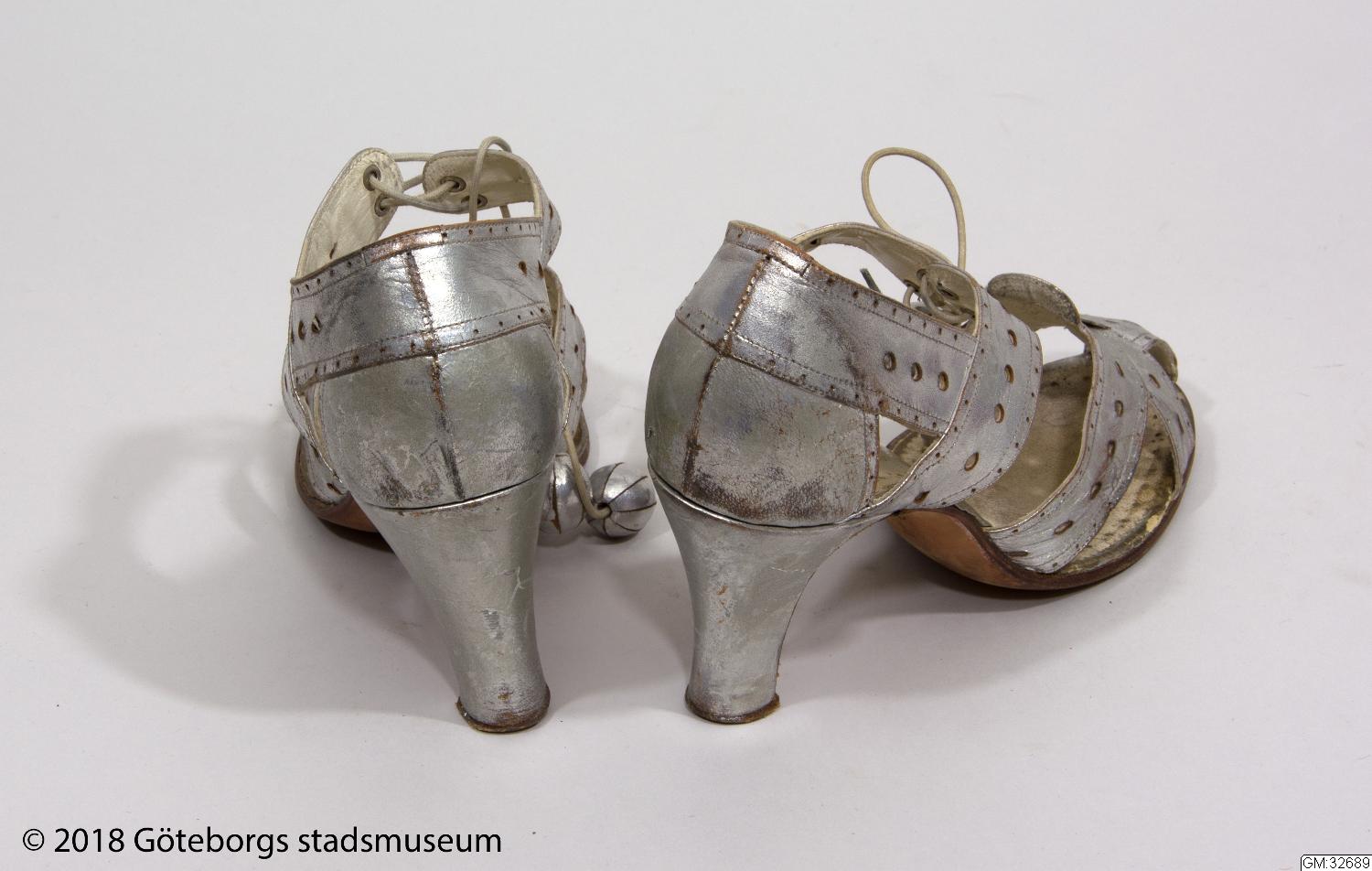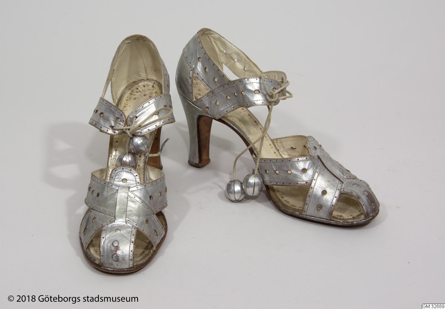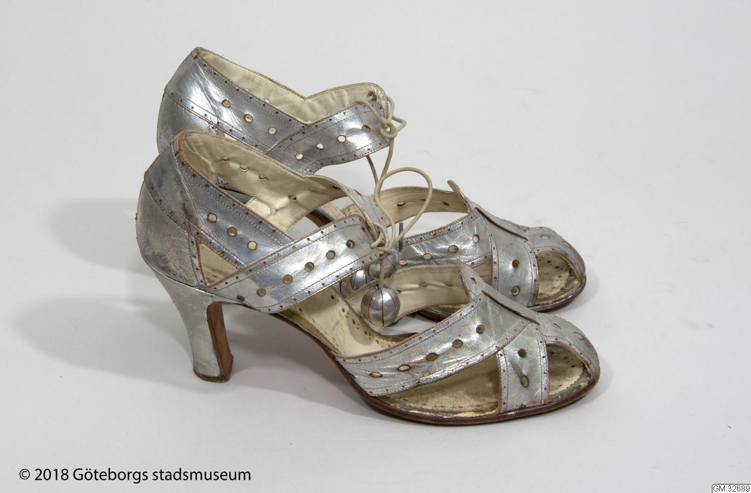 Aftonskor för dam, ca 1938. Sandalettmodell av silverfärgat skinn på höga smala klackar med delvis öppet perforetrat remförsett tåparti. Knytband med kulor av skinnet. Storlek 38, längd 25 cm, höjd 15 cm. Märkta Hedströms = tillverkare eller återförsäljare.