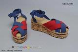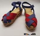 - Ett par sandaler med hög sula av flätad halm. Sandalen har remmar i blålila och rosaröd som går i kors över tån. Över hälen går remmar i blålila som knäpps runt vristen med ett spänne i vit metall. Sulan är 4,5 cm hög fram och 7 cm hög vid klacken. Innersulan är av ljusbrunt konstläder och yttersula finns ej utan utgörs endast av halm. /aan