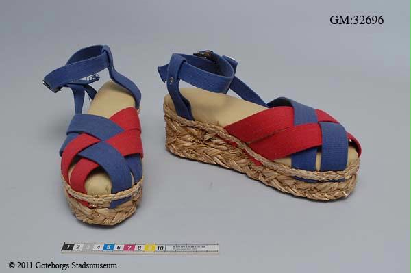 Ett par sandaler med hög sula av flätad halm. Sandalen har remmar i blålila och rosaröd som går i kors över tån. Över hälen går remmar i blålila som knäpps runt vristen med ett spänne i vit metall. Sulan är 4,5 cm hög fram och 7 cm hög vid klacken. Innersulan är av ljusbrunt konstläder och yttersula finns ej utan utgörs endast av halm. /aan