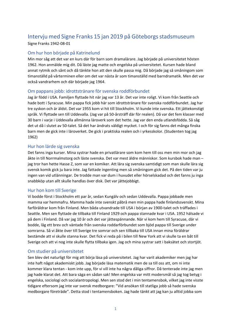 Signe Franks deltog som publik i Mellanrum, en samtalsserie om stadsutveckling, som genomfördes i foajén på Göteborgs stadsmuseum den 28 november 2018. Ämnet var: Hus för kultur och det var seriens 98:de seminarium. Signe ställde sig upp och berättade att hon arbetat på det anrika landeriet Stora Katrinelund och att det fungerat som ett kulturhus för alla. Informationen var helt ny för mig som aldrig hört talas om landeriets nutidshistoria bara berättelser om dess högrestånd.