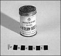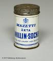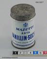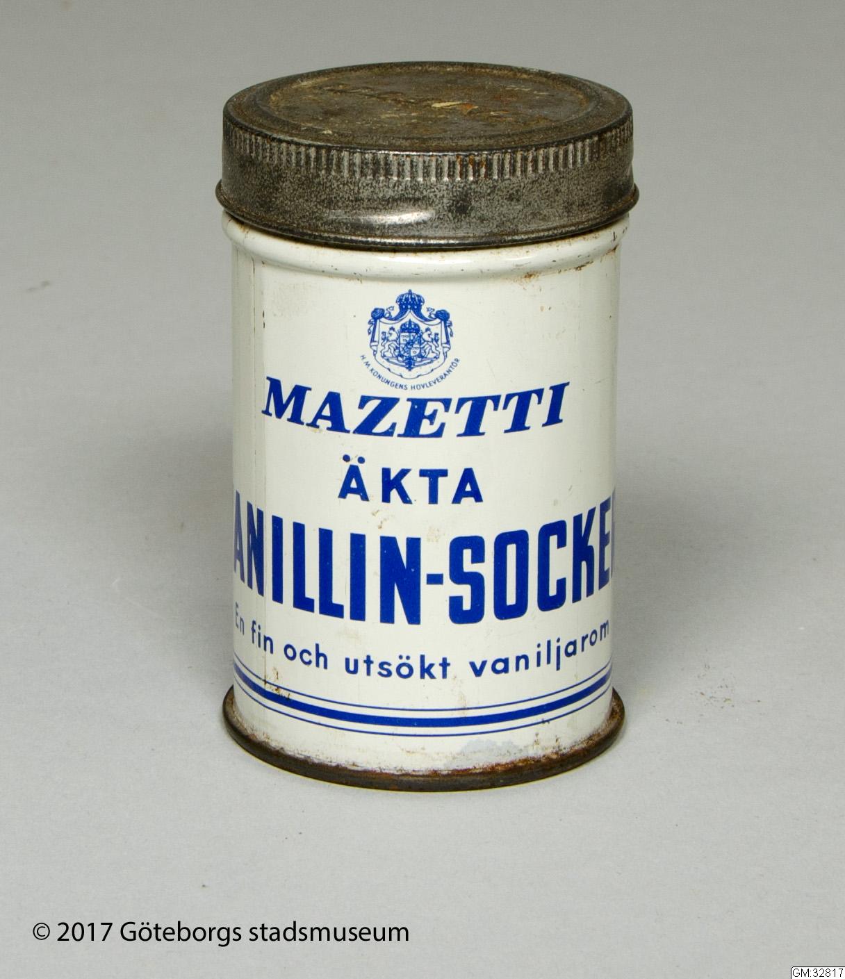 Cylindrisk burk med lock. Tryck i blått på vitt "MAZETTI ÄKTA VANILLIN-SOCKER"med versal text "En fin och utsökt vaniljarom" i gemena bokstäver. Ett emblem för att det är "H.M Konungens Hovleverantör". Det är också tryckt "MAZETTI" på locket.