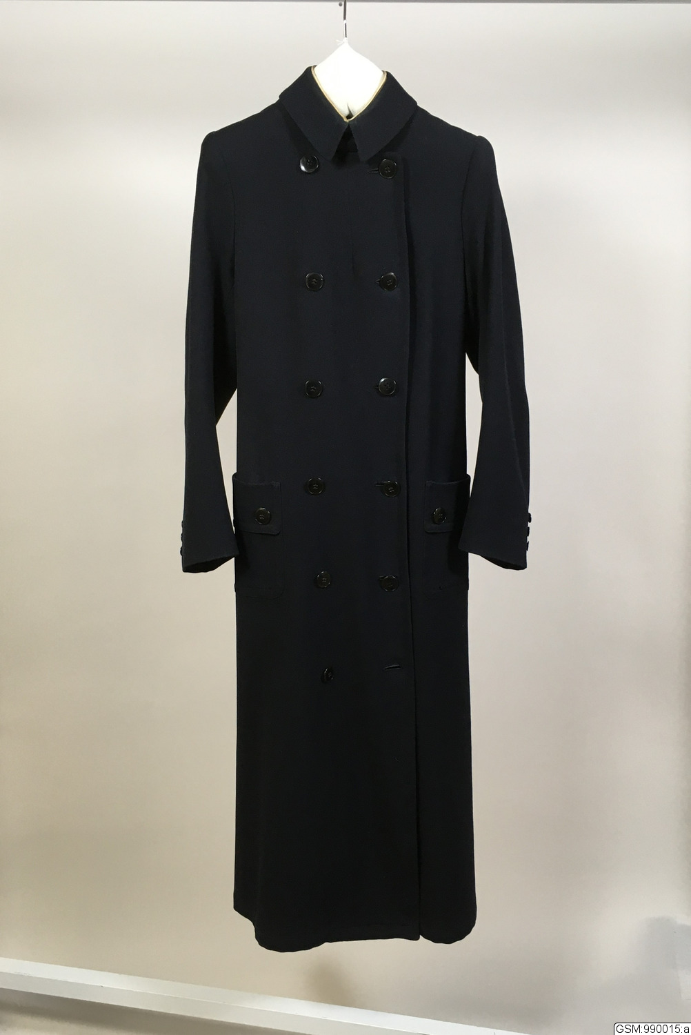 - hellång med lång tvåsömsärm. Dubbelknäppt framtill med 12 st svarta knappar. Nedvikt krage med ett ljust band fastsytt på insidan av halslinningen. I halsen knäppt med 3 st hackar och utanpå dem en löstagbar sleif som knäpps med en liten svart knapp (dold av kragen) på var sida. På insidan av kappans nederkant finns en dold knäppning med två mindre svarta knappar och hällor. Utanpåfickor på båda sidor. Upptill är kanten nedvikt mot utsidan av fickan med två svarta knappar som dekoration. På högra fickan saknas dock en av dessa knappar. Kappan är fodrad endast på övre delen. Två stycken bälgveck baktill, nedsydda på livdelen och öppna nedanför midjan. "Skärp" vikt bakåt i midjan och hopfäst med två svarta knappar.