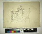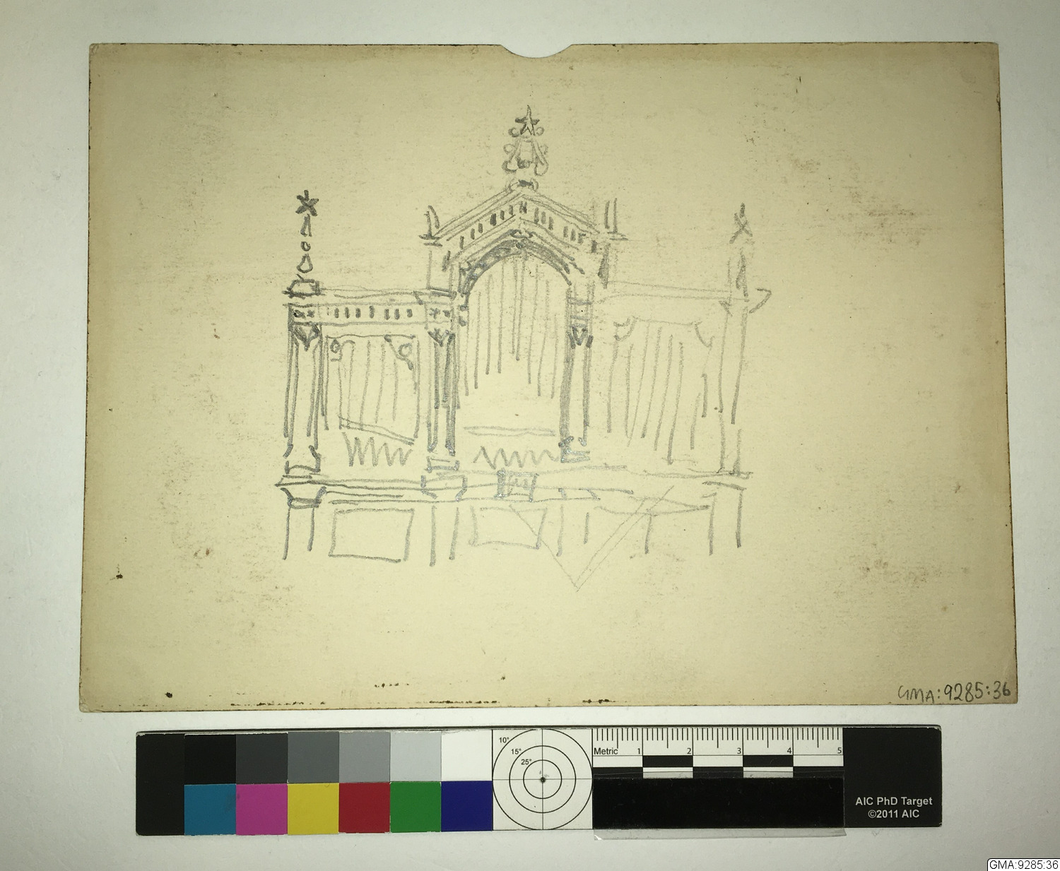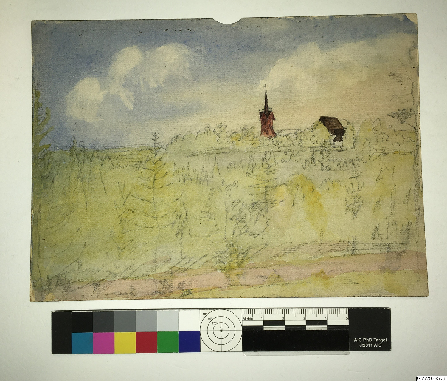 Akvarell målning som förställer en röd kyrka i skogen och på baksidan en okänd byggnads detaljer.