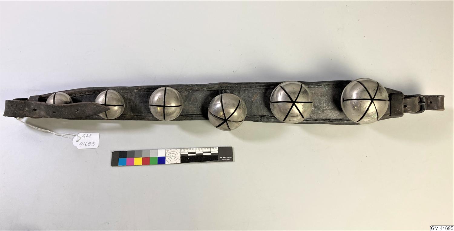 6 bjällror på vadderad seldonsdel med spänne i båda ändar. Bjällrorna sitter i rad med ökande storlek.