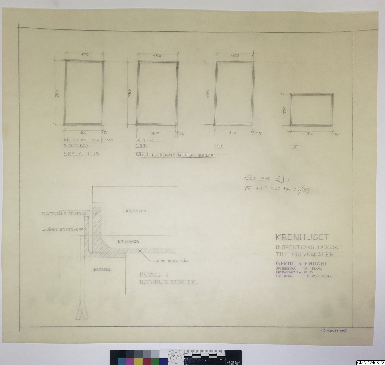 - Uppmätningsritning till Kronhuset; Golvluckor av Arkitekt SAR Gerdt Stendahl, gjorde till den pågående ombyggnader av huset.